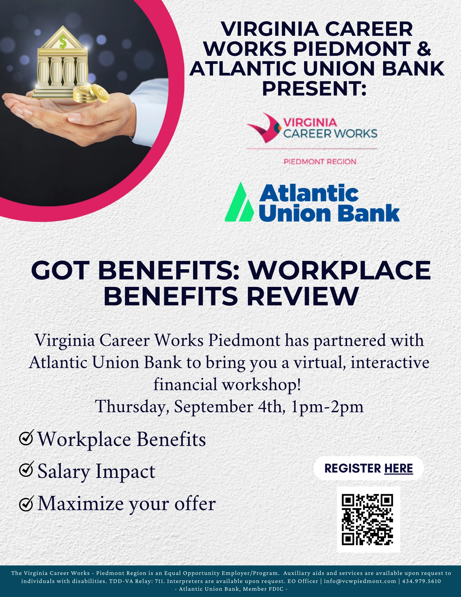 FeaturedCareer and Workforce Innovation Campus (944) 944 Glenwood Station Lane, Suite 103, Charlottesville, VA, United StatesWant to better understand your workplace benefits and how they impact your salary? 💼💸 Join Virginia Career Works Piedmont and Atlantic Union Bank for this dynamic session designed to help you make the most of your job offer!