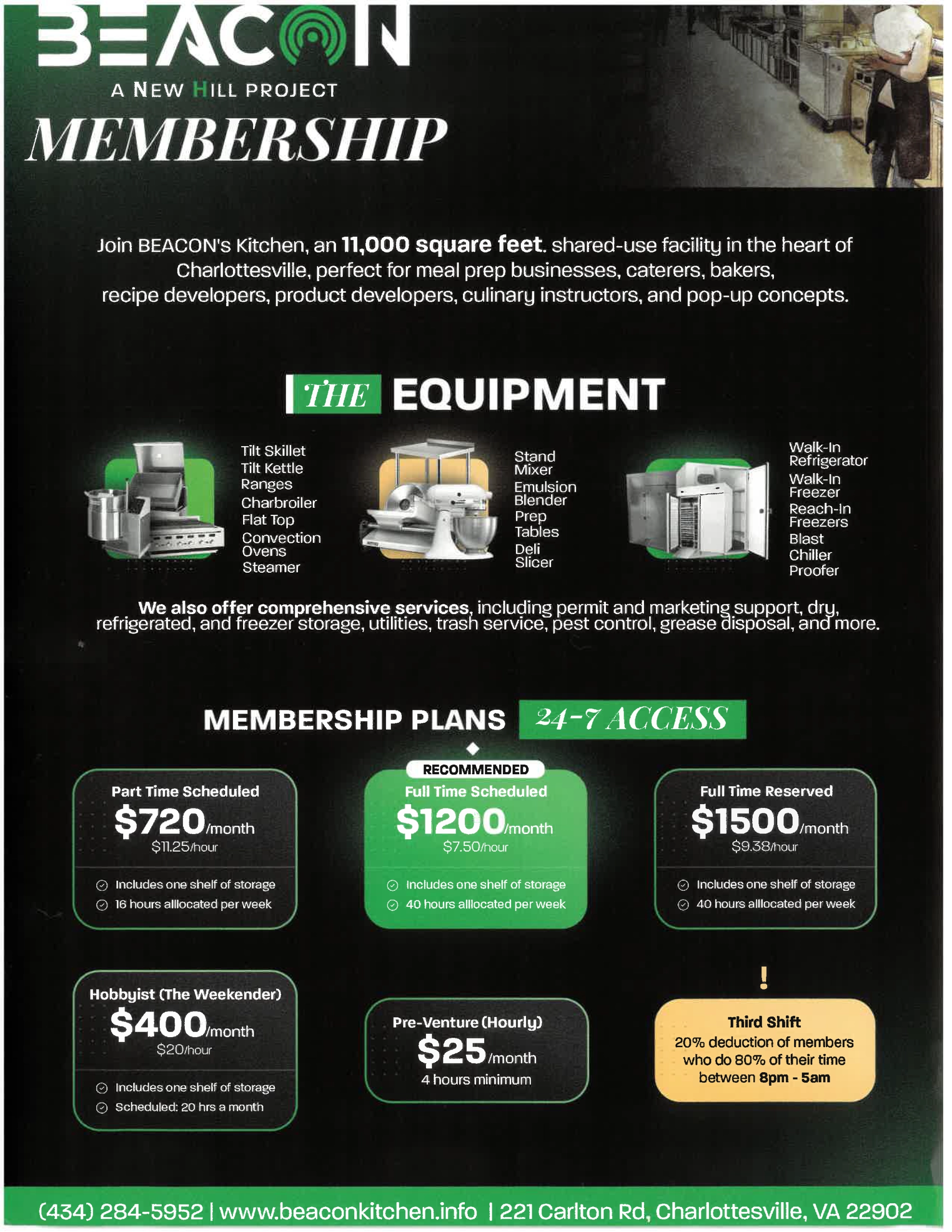 BEACON Kitchen 221 Carlton Road, Unit 1, Charlottesville, VA, United StatesBEACON Kitchen is a shared-use commercial kitchen located in the heart of Charlottesville for aspiring chefs, established food brands and everyone in between. This kitchen is an economic development effort of New Hill Development to attend their official ribbon-cutting ceremony from 12 to 1 pm, and then enjoy the after party from 1 to 4 pm.