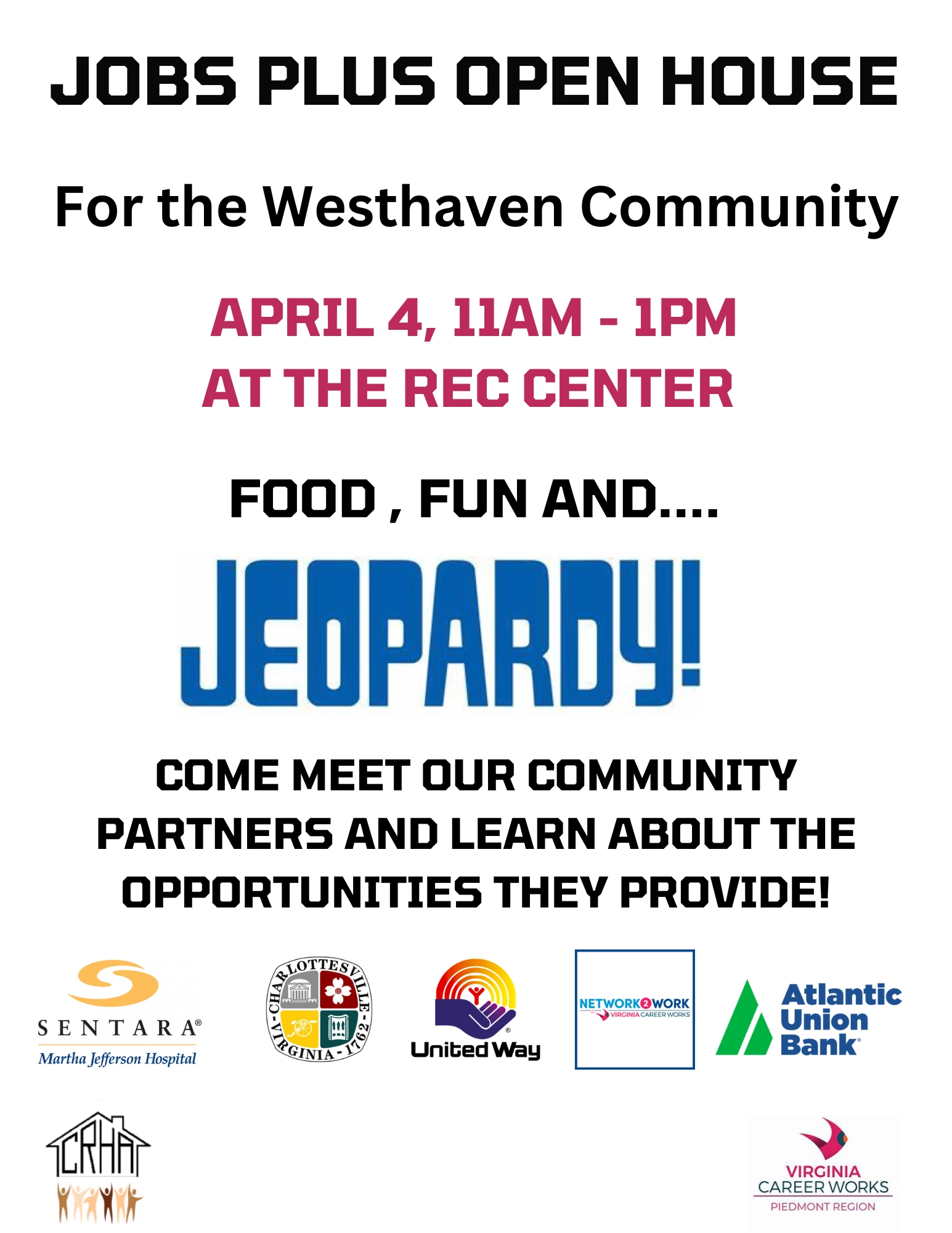 Westhaven Community Center 801 Hardy Drive, Charlottesville, VA, United StatesCurrent residents, join VCWP at an Open House to celebrate the Jobs Plus Initiative Program at Westhaven!