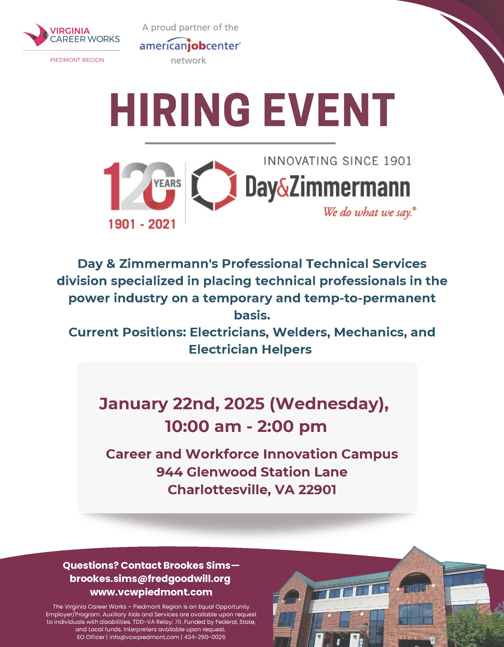 Career and Workforce Innovation Campus (944) 944 Glenwood Station Lane, Suite 103, Charlottesville, VA, United StatesDay & Zimmermann's Professional Technical Services division specialized in placing technical professionals in the power industry on a temporary and temp-to-permanent basis. Current Positions: Electricians, Welders, Mechanics, and Electrician Helpers