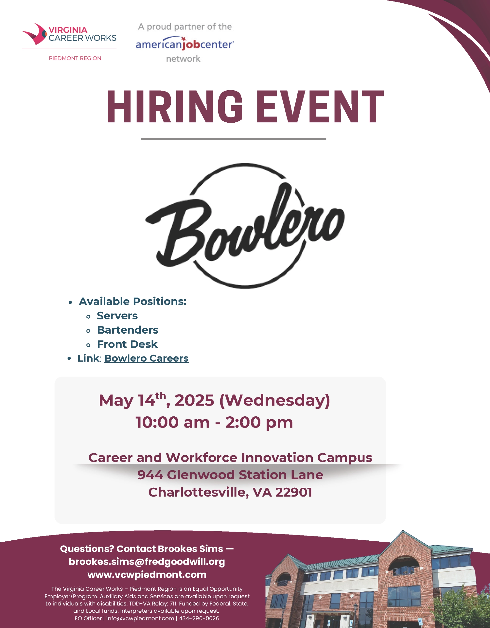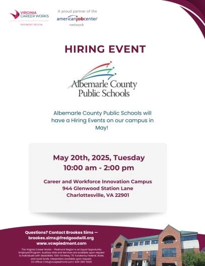 Virginia Career Works--Charlottesville Center 944 Glenwood Station, Suite 103, Charlottesville, VA, United StatesAlbemarle County Public Schools will have a Hiring Events on our campus in May!