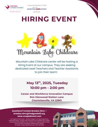 Virginia Career Works--Charlottesville Center 944 Glenwood Station, Suite 103, Charlottesville, VA, United StatesMountain Lake Childcare center will be hosting a Hiring Event at our campus. They are seeking dedicated Lead Teachers and Teacher Assistants to join their team!