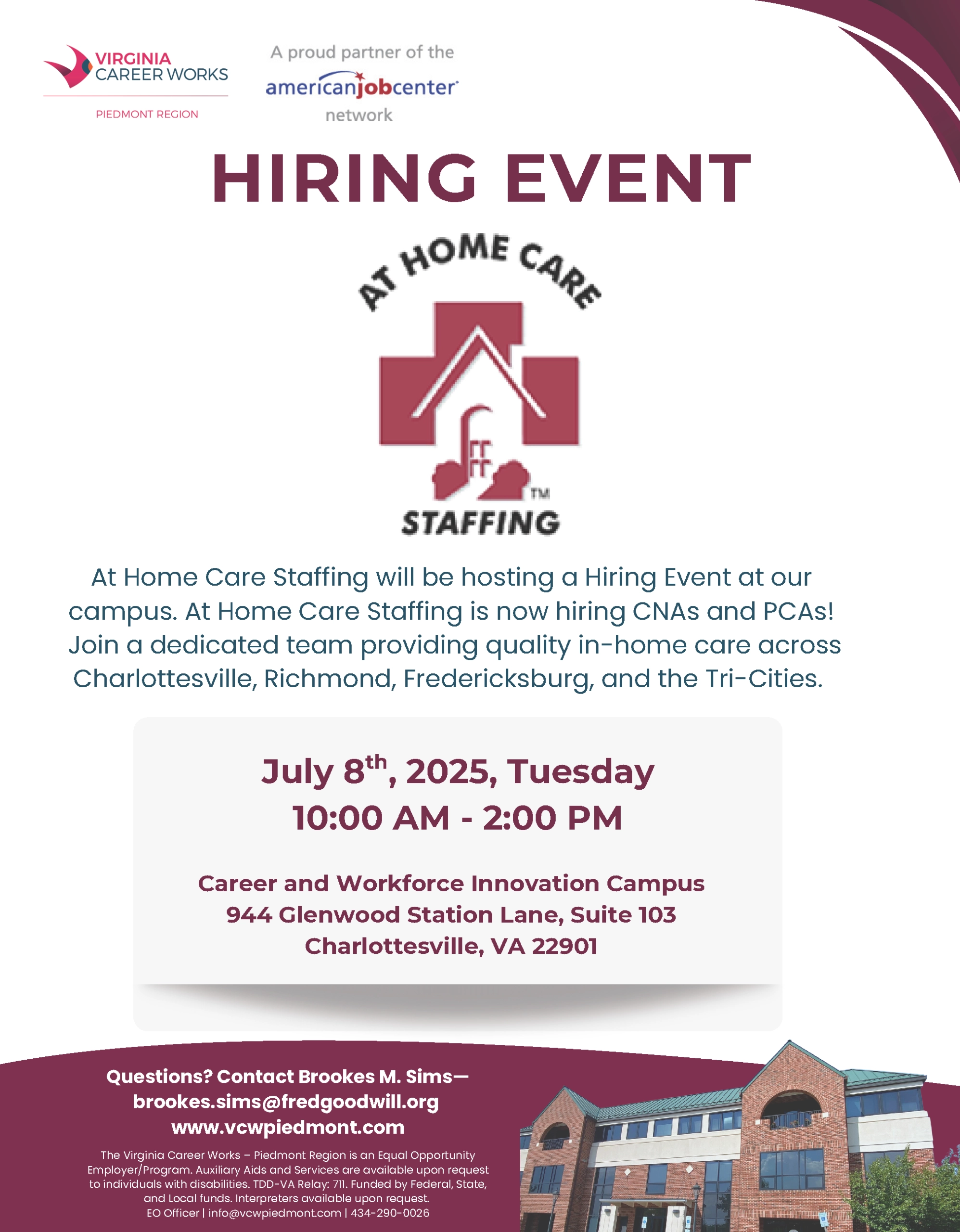FeaturedVirginia Career Works - Charlottesville Center 944 Glenwood Station Lane, Suite 103, Charlottesville, VA, United StatesLooking for a rewarding career in home healthcare? Join AT Home Care Staffing at the Virginia Career Works Charlottesville Center for an in-person Hiring Event.