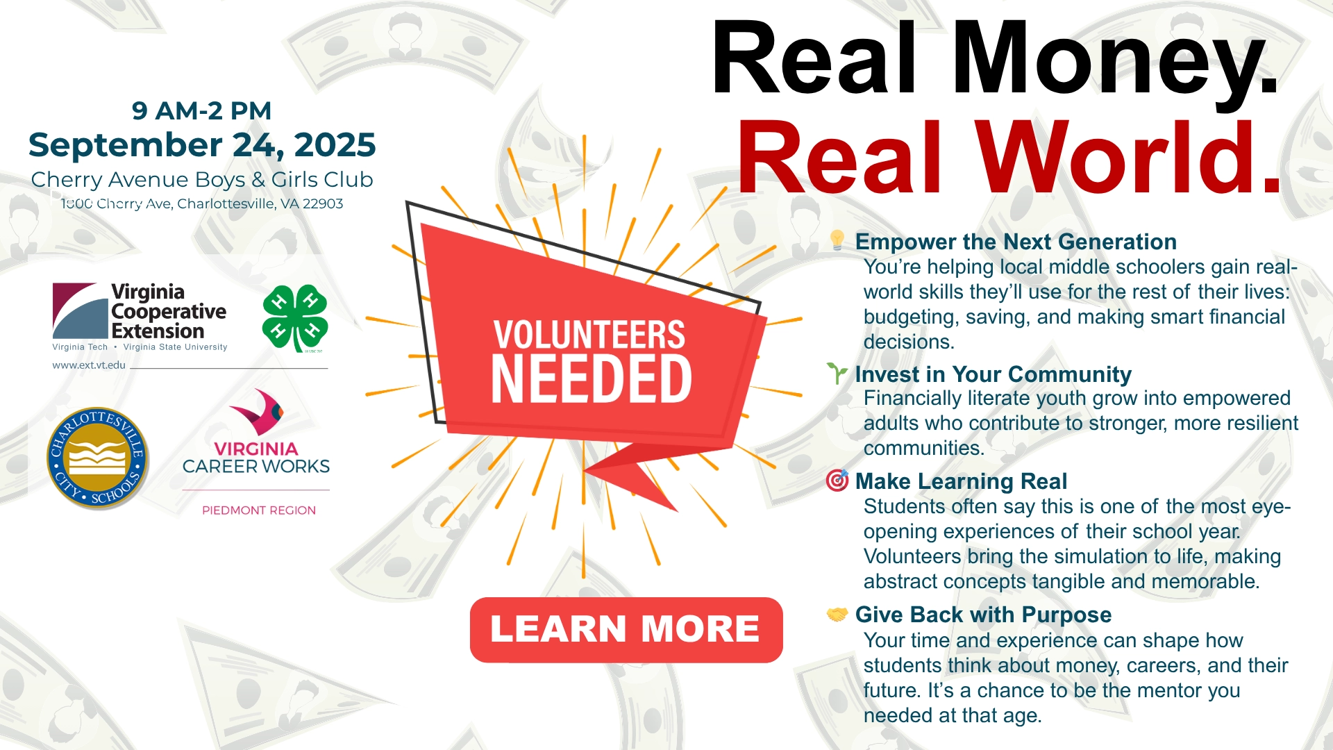 FeaturedA hands-on financial literacy simulation for middle and high school students, hosted by Virginia Career Works - Piedmont in partnership with Charlottesville schools and Virginia Cooperative Extension. Students explore budgeting, career choices, and real-world financial decisions in a fun, interactive format.