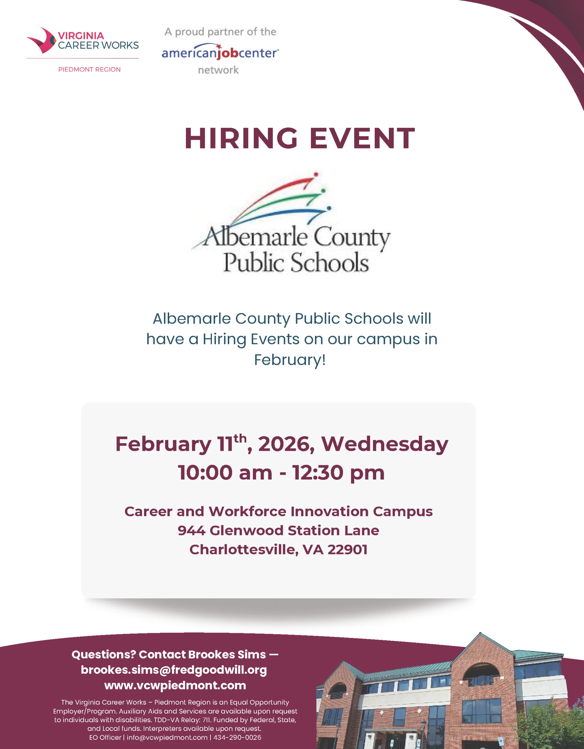 Mark your calendar! VCWP is hosting an in-person Hiring Event with Albemarle County Public Schools at our Charlottesville center!