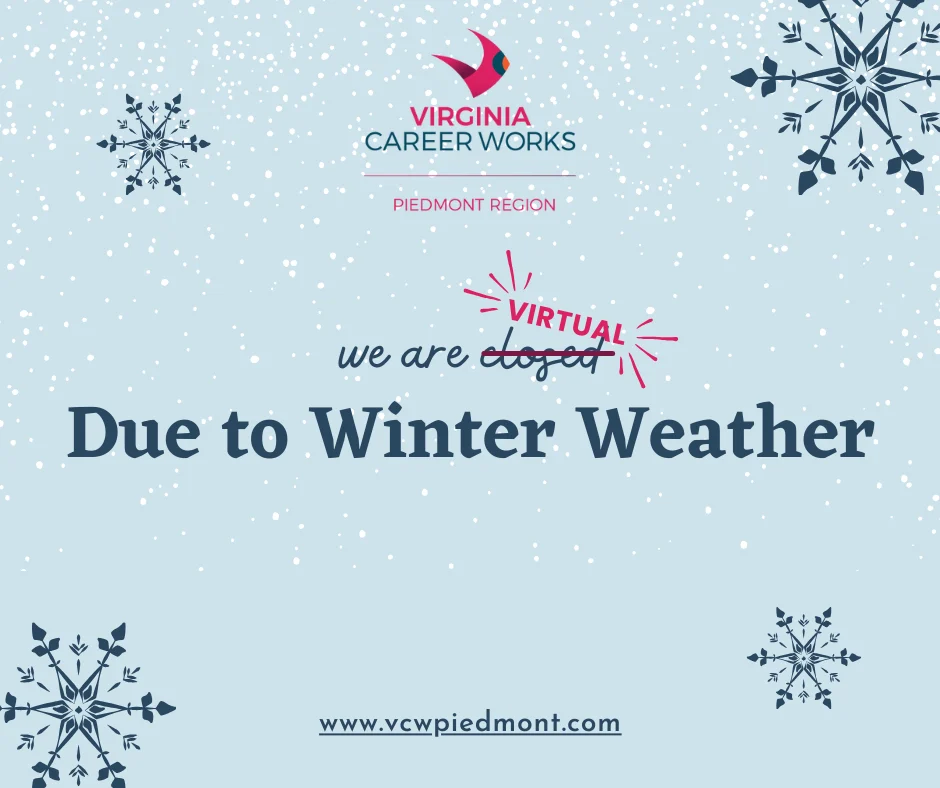 1 event,Virginia Career Works - Piedmont Region will be closed in observance of Presidents Day. Normal business hours will resume on February 17, 2026. |