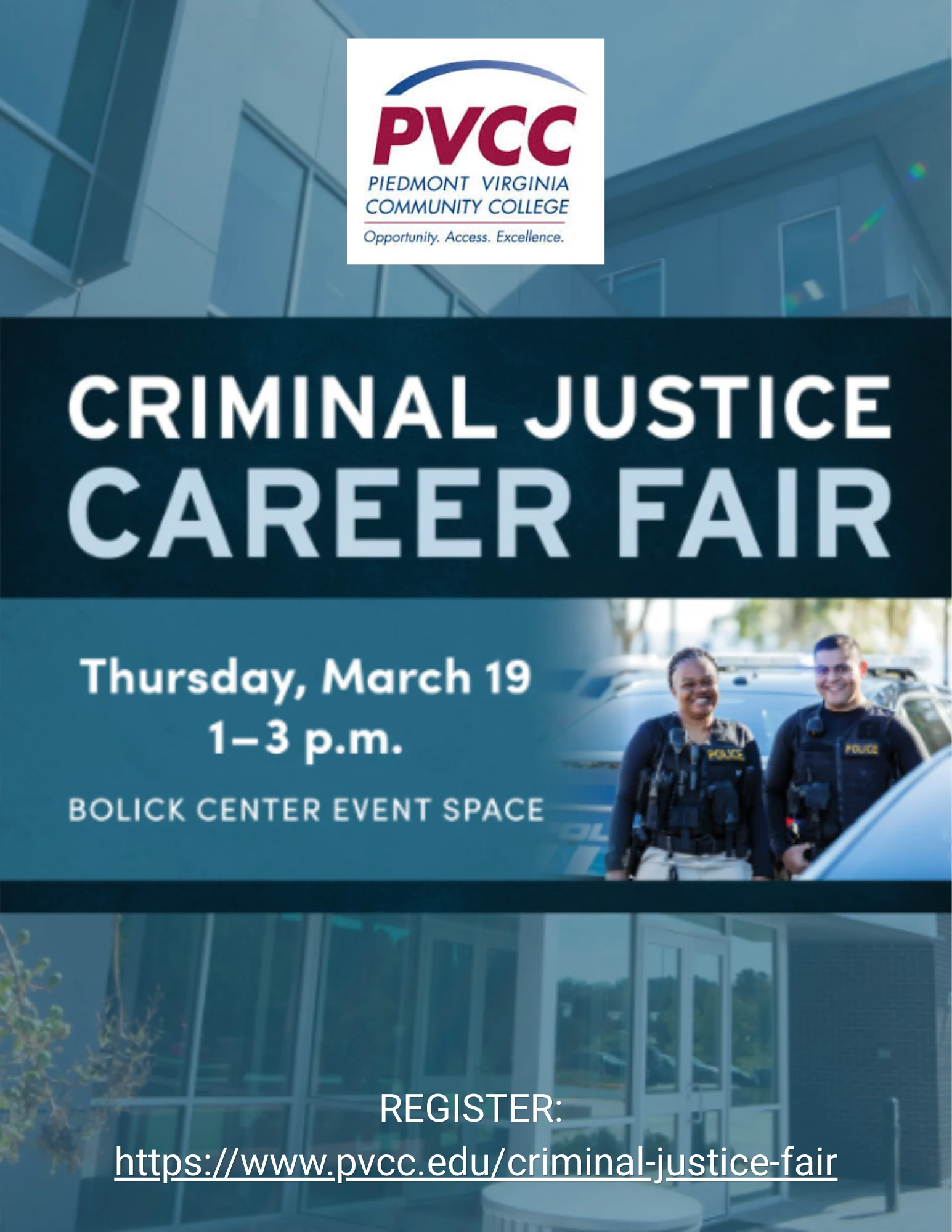 Come explore the field of law enforcement at the Criminal Justice Career Fair at PVCC, Thursday, March 19, 1-3 p.m., in The Bolick Center. The Fair is for those interested in law enforcement, corrections, probation and civilian positions in the law enforcement community, and presents the opportunity to meet with criminal justice professionals from agencies that are hiring. This is a free event, open to the public and students of any major.
