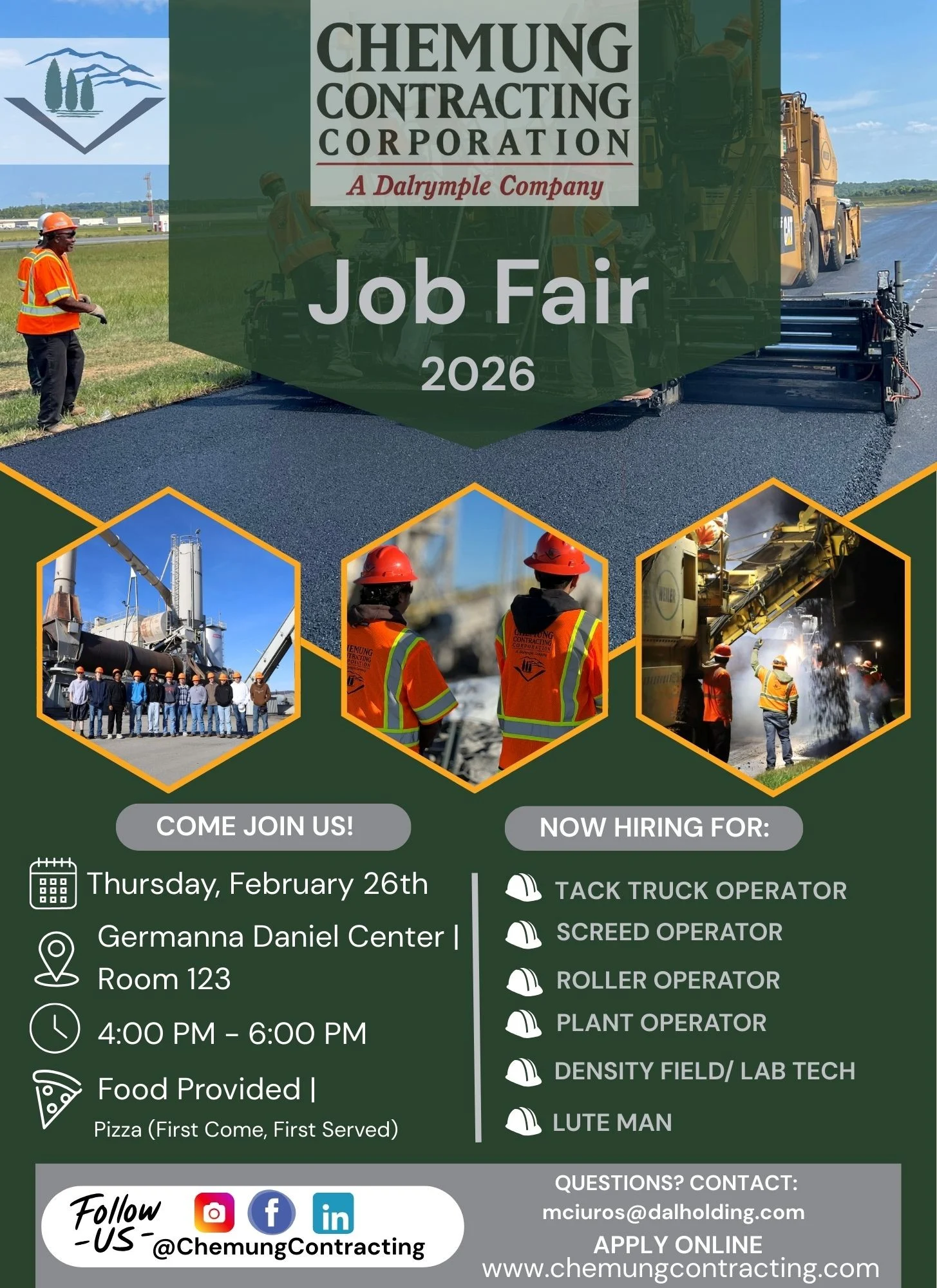 Looking for a hands‑on career in construction with a company that builds Virginia’s roads and infrastructure? Chemung Contracting Corporation (a Dalrymple Company) is hosting a Job Fair at Germanna - Daniel Technology Center and wants to meet you!