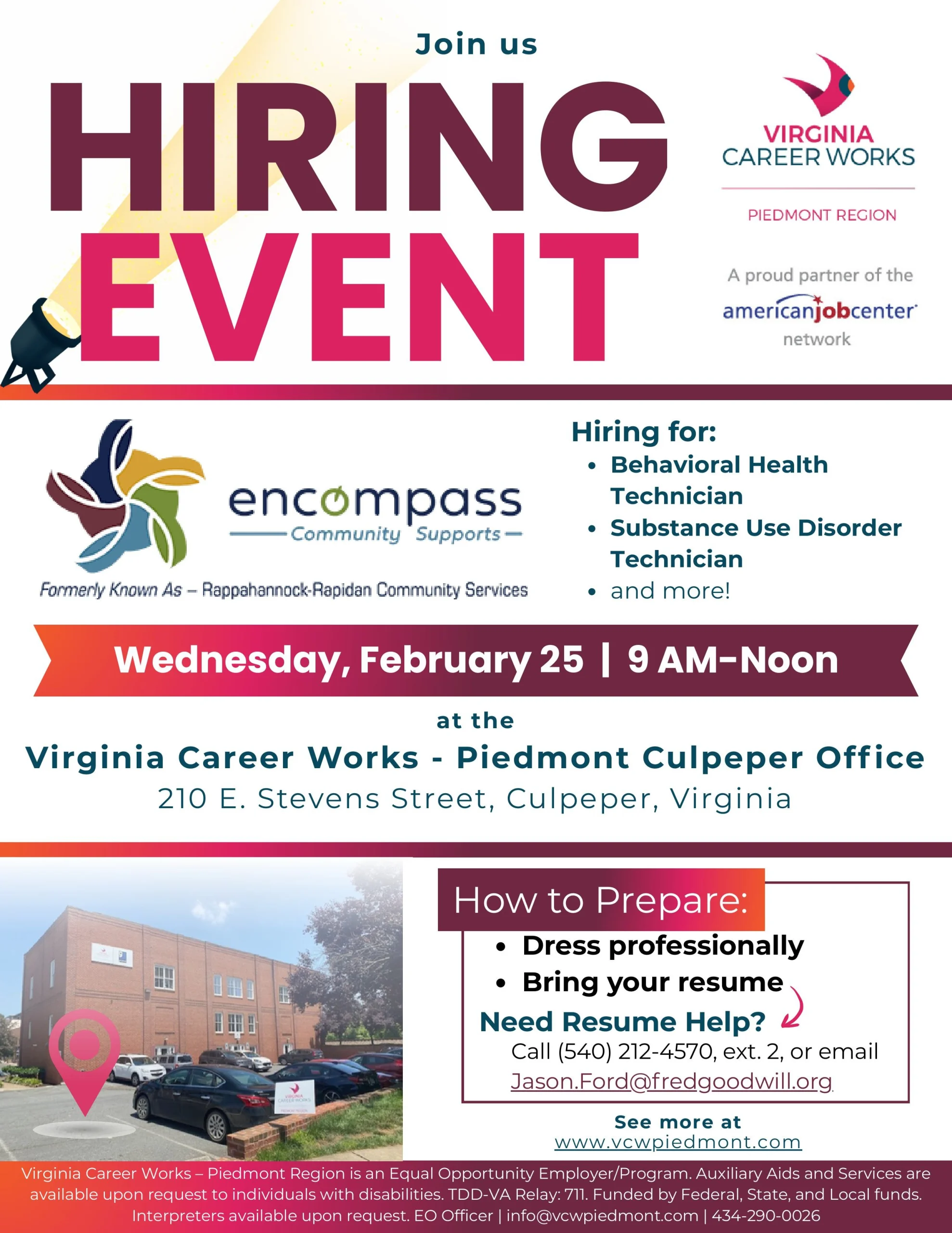Virginia Career Works - Piedmont's Culpeper office is hosting a hiring event with Encompass Community Supports (formerly Rappahannock‑Rapidan Community Services). Join us to learn about rewarding career opportunities supporting individuals and families in our region.